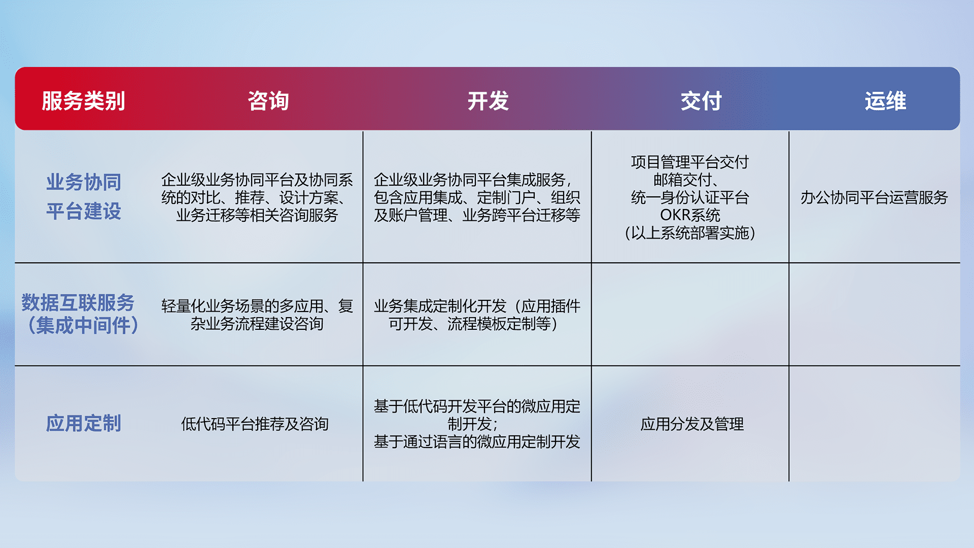 针对钉钉、、、、企微、、、IDaas等平台级产品提供产品的规划、、、、方案、、交付、、、定制化开发等服务,,实现如统一协同办公、、、智能客户服务、、、、混合会议管理、、、、智能数据查询、、等业务场景,,实现数字化转型。。